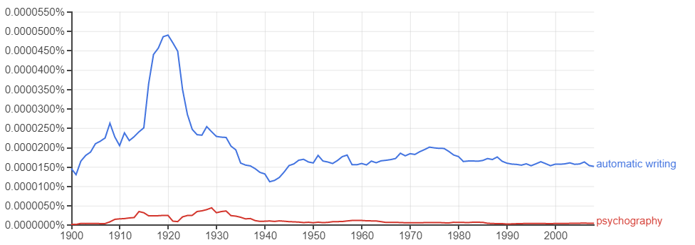 Graphiques de la fréquence de l'emploi dans le temps des mots ”automatic writing” ("écriture automatique") et ”psychography” ("psychographie")